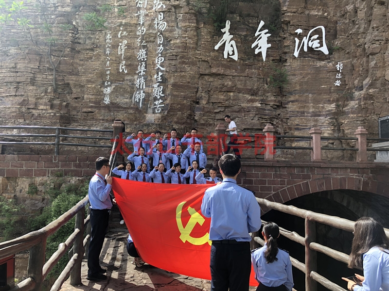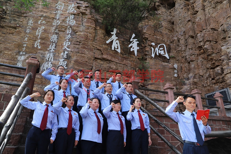 學(xué)員們踏上350米的廊橋——“紅飄帶”,來到青年洞洞口。1973年,全國(guó)人大常委會(huì)副委員長(zhǎng)郭沫若親自題寫了洞名。洞口刻有李先念、江澤民題詞。學(xué)員們集體在洞口合影留念,并重溫入黨誓詞。
