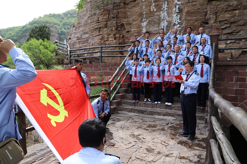 學(xué)員們踏上350米的廊橋——“紅飄帶”,來到青年洞洞口。1973年,全國人大常委會(huì)副委員長郭沫若親自題寫了洞名。洞口刻有李先念、江澤民題詞。學(xué)員們集體在洞口合影留念,并重溫入黨誓詞