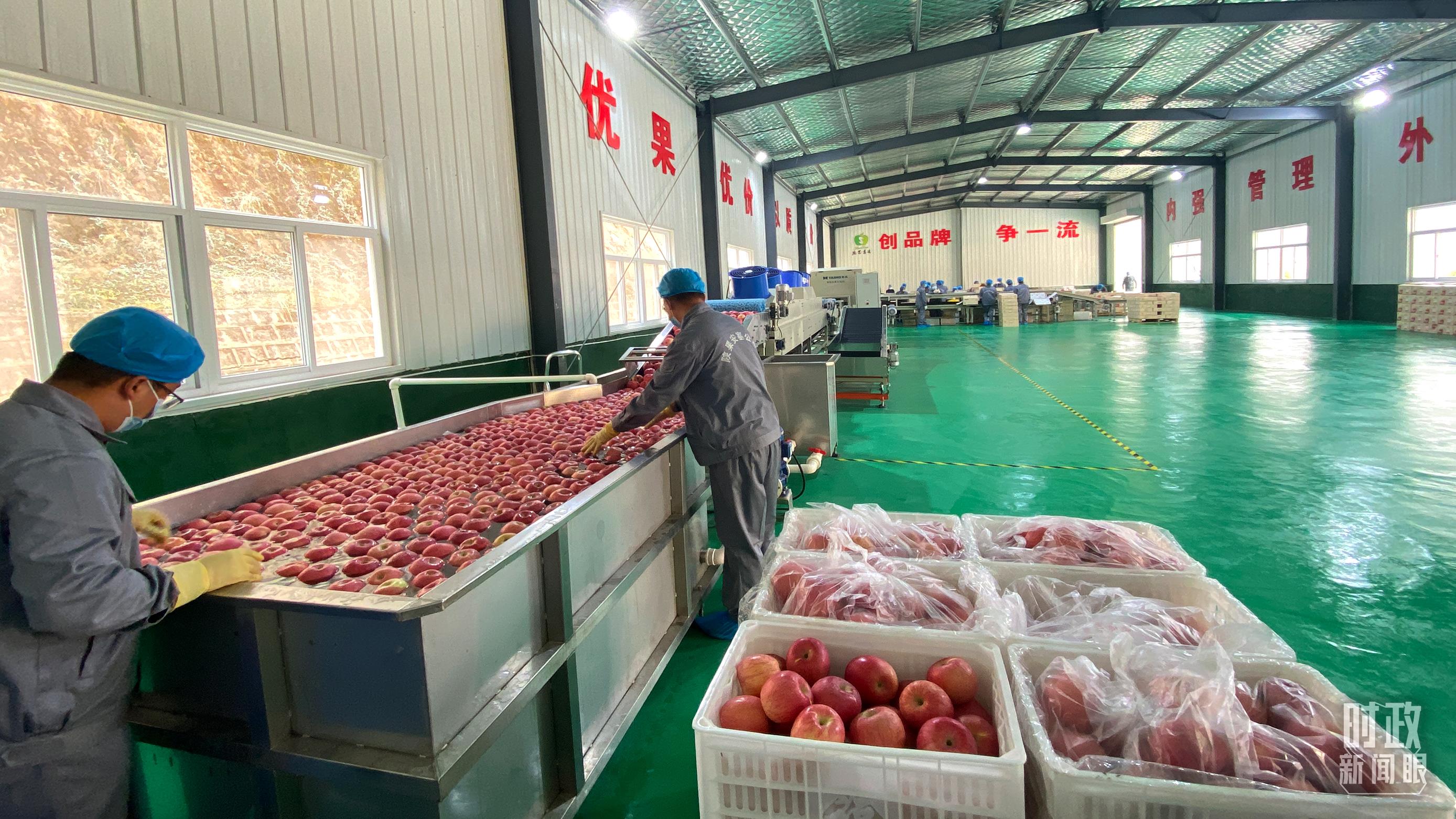 △南溝村,蘋果洗選車間。